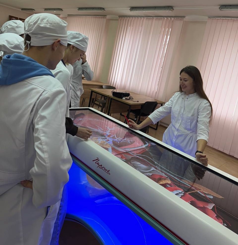 дыхательной системы». 🤝Мероприятие организовано при участии врача-терапевта ГБУЗ «ЛГП №11» ЛНР Мосягиной Надежды Александровны совместно с кафедрой анатомии человека и кафедрой топографической анатомии и оперативной хирургии ФГБОУ ВО «ЛГМУ им. Свт. Луки» Минздрава России. ❤️ В ходе занятия, с использованием интерактивного анатомического стола «Пирогов», были рассмотрены анатомо-физиологические особенности органов дыхательной системы, их топографические взаимоотношения, а также клинические аспекты, имеющие важное значение в практической деятельности врача-терапевта. Особое внимание было уделено взаимосвязи нормальной и клинической анатомии, что позволило студентам лучше понять значение фундаментальных дисциплин в будущей профессиональной деятельности. 👩⚕️Надежда Александровна поделилась практическим опытом работы, привела клинические примеры из врачебной практики, что вызвало живой интерес у обучающихся и способствовало формированию профессиональной мотивации. ❗️Проведенное занят