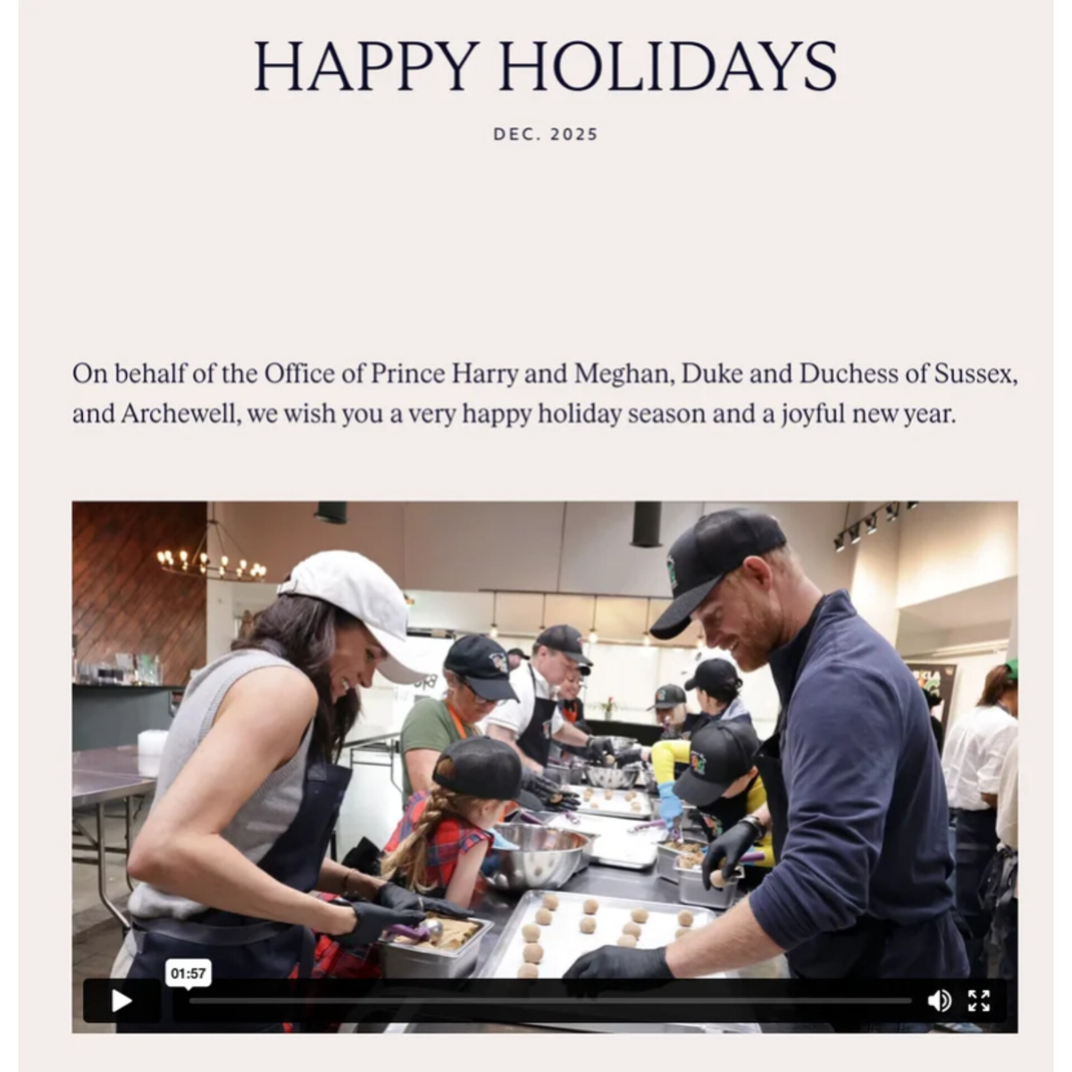 Вместо фотографии пара представила двухминутный ролик, демонстрирующий Сассекских и их детей во время посещения общественной кухни и приготовления еды для нуждающихся в честь Дня Благодарения.