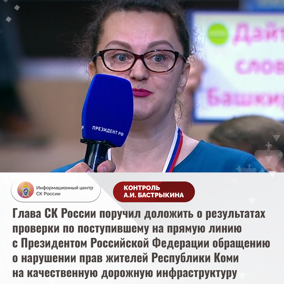 Глава СК России поручил доложить о результатах проверки по поступившему на прямую линию с Президентом Российской Федерации обращению о нарушении прав жителей Республики Коми на качественную дорожную инфраструктуру