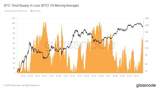 ? Цена: $87 956 (–1.02% ↘️) 📈 Ключевая статистика: на 6.7 млн BTC (23.7%) находятся в убытке – максимум в текущем цикле. Из них 10.2 % принадлежат долгосрочным держателям, 13.5 % – краткосрочным трейдерам. При удержании цены ниже $90 k биткойн может продолжить падать до $101.5 k – ключевой зоне стоимости «Смокинг» для коротких держателей. 📊 Ключевые моменты: - Биткойн торгуется под психологическим уровнем $90 k, отставая от динамики восстановления. - 6–7 млн BTC в убытке формирует “тяжёлую” структуру предложения, ограничивая рост. - Находится риск дальнейшего коррекционного падения, пока цена не пересечет $101.5 k. ⚠️ Риски: Потенциальный дальнейший спад до $82 k при отсутствии восстановления. Горизонт: Среднесрочный (2–4 недели).