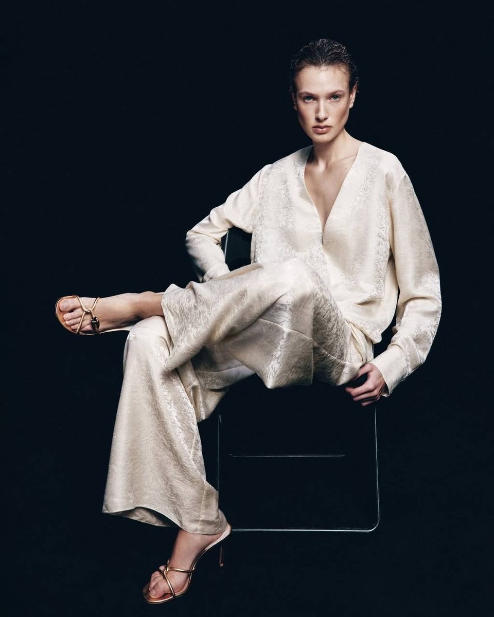 Костюм в пижамной эстетике — один из самых актуальных приёмов последних сезонов. Свободный крой, текучая ткань и спокойный оттенок Cloud Dancer создают ощущение расслабленной роскоши. Это не про домашнюю одежду, а про осознанный комфорт и стиль без напряжения.