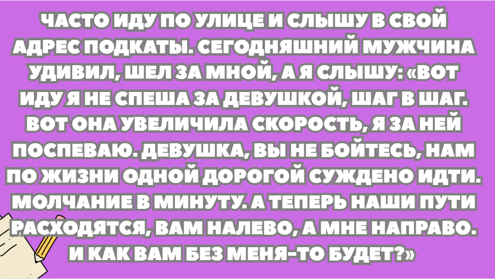 - Сидела днем на лавочке в парке, ела мороженое, как вдруг ко мне парень подходит какой-то взволнованный. Задает странный вопрос: «Ой, девушка, а вы в порядке?» Я удивилась, ответила, что да, со мной все хорошо, а потом спросила: «Почему вы спрашиваете?» Незнакомец как будто из 2007 говорит: «Наверное, больно падать с небес. Вы же прекрасны, словно ангел!» Если бы я раньше просто поржала с такого подката, то сейчас мне стало приятно и как-то тепло внутри. Ностальгия. Даже контакт ему свой дала, вроде милый парень.