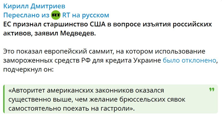 Фактически дерибана российских активов не произошло. Однако Financial Times пишет про один любопытный момент: ...лидеры единогласно утвердили план "Б". Однако в небольшой уступке Мерцу они согласились «продолжить работу» над возможностью увязать российские активы с займом, если Москва откажется платить репарации. «Мы нашли способ перекинуть мост между двумя моделями», — заявила премьер-министр Дании Метте Фредериксен. «До начала встречи я предпочитала первый вариант, но считаю, что второй тоже вполне хорош», — заключила она. Да, ЕС оставил возможность реализации "плана Трампа", но российские активы уже бессрочно заморожены, и их разморозка потребует нового официального решения ЕС. Кроме того, полного отказа от идеи конфискации российских активов - нет.