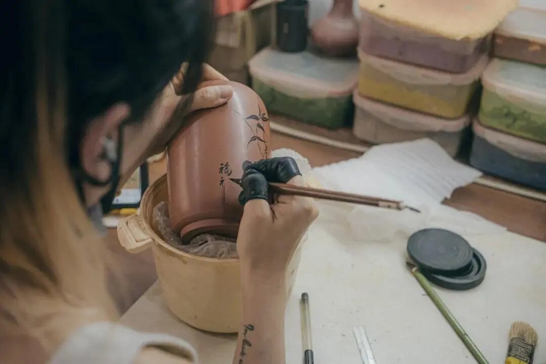 1. Кэхуа (гравировка): На еще влажную необожженную заготовку наносится рисунок или каллиграфия. Затем специальным резцом мастер прорезает контуры на глубину 2-3 мм.
