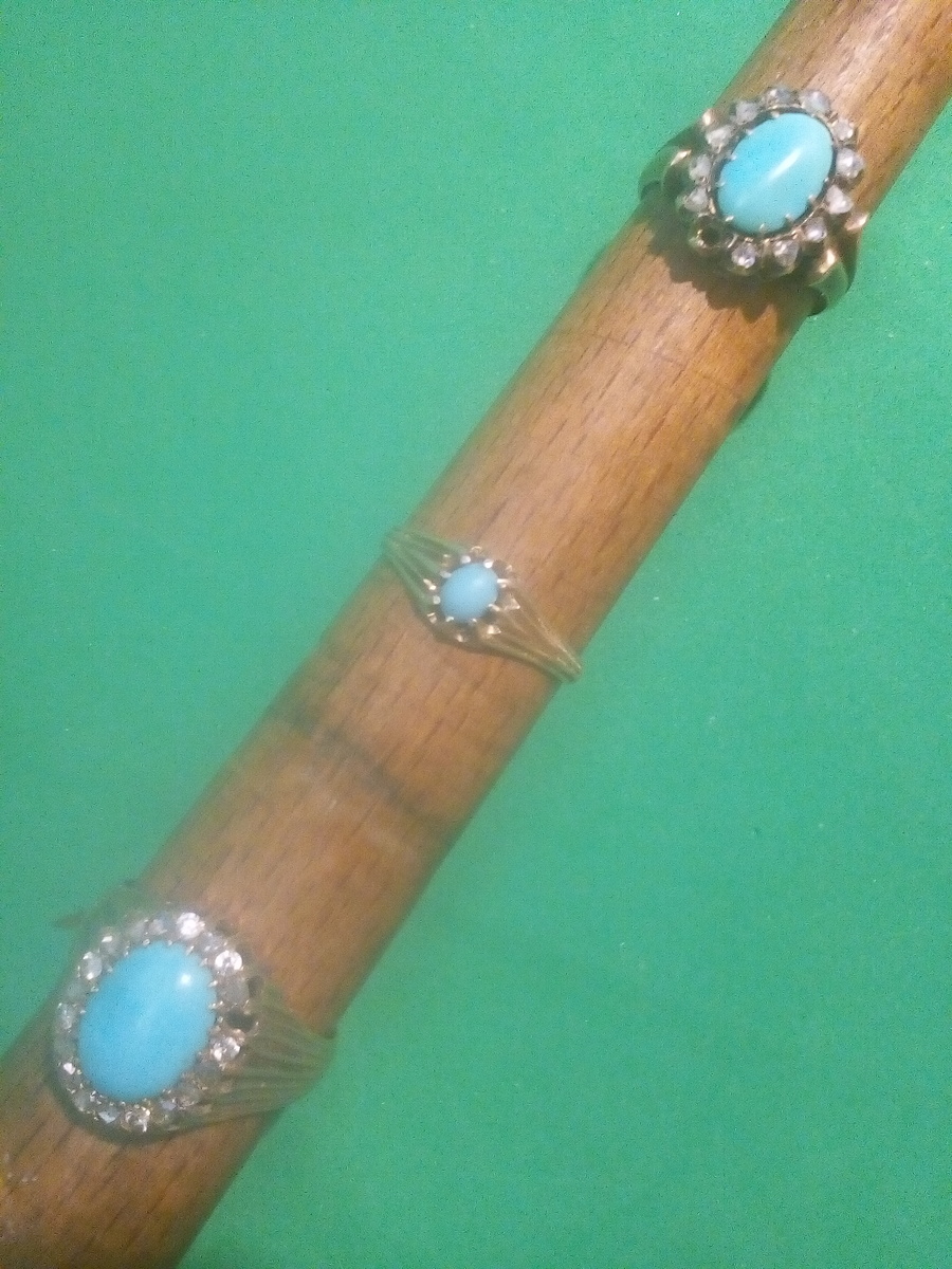 Клейм нет. Может, никогда не было. Может - удалили по какой причине... У двух алмазы в обсыпке, некоторые заменены стеклом ( или фианитами). По моим представлениям - не бирюза, а имитация. :0) Спасибо за просмотр....