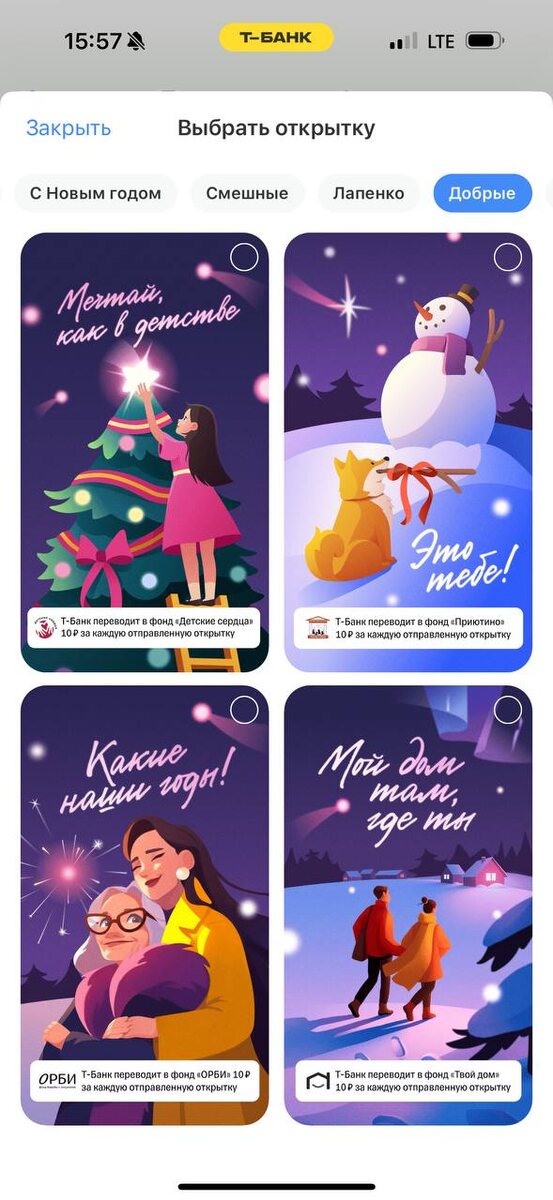 В декабре мы часто делаем переводы родным и близким, но сейчас можно совместить это простое действие с реальной помощью. Просто переводите деньги в приложении с «Доброй Открыткой», а банк перечислит по 10 рублей от каждой отправленной открытки в фонды. Благотворительность это просто. С наступающим!