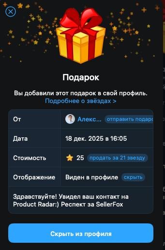 Нашёл мой контакт на Product Radar, отправил подарок и написал пару тёплых слов благодарности за наш сервис аналитики SellerFox. Без просьб. Без продаж. Просто так. Редкий случай в наше время. И, честно, приятно. Спасибо 🙂 Marketplace_biz - отдай свой буст каналу