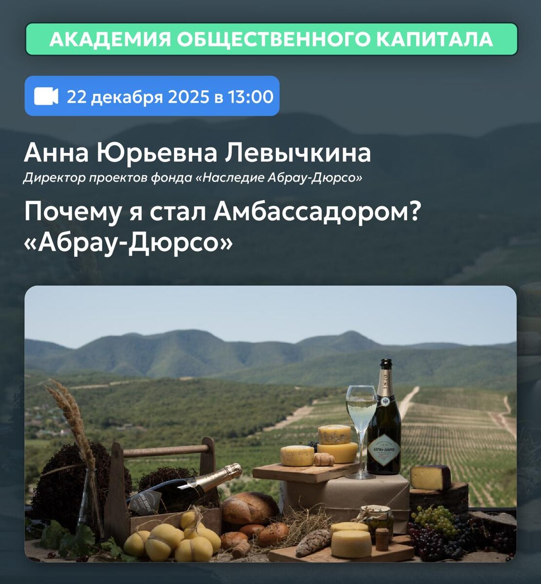 !🎄 К нам в гости придет директор проектов фонда «Наследие Абрау-Дюрсо» Анна Юрьевна Левычкина и расскажет: ➡️ Секреты производства самого новогоднего напитка 🍾 ➡️ Об одном из самых ярких экспонатов в коллекции старейшей винодельни ➡️ Про социальную ответственность - важную часть корпоративной ДНК «Абрау-Дюрсо ➡️ О том, как чтут традиции в «Абрау-Дюрсо» и берегут наследие, передавая опыт из поколения в поколение. 🔗 Начало вебинара в 13.00. Участие бесплатное. Регистрация по ссылке