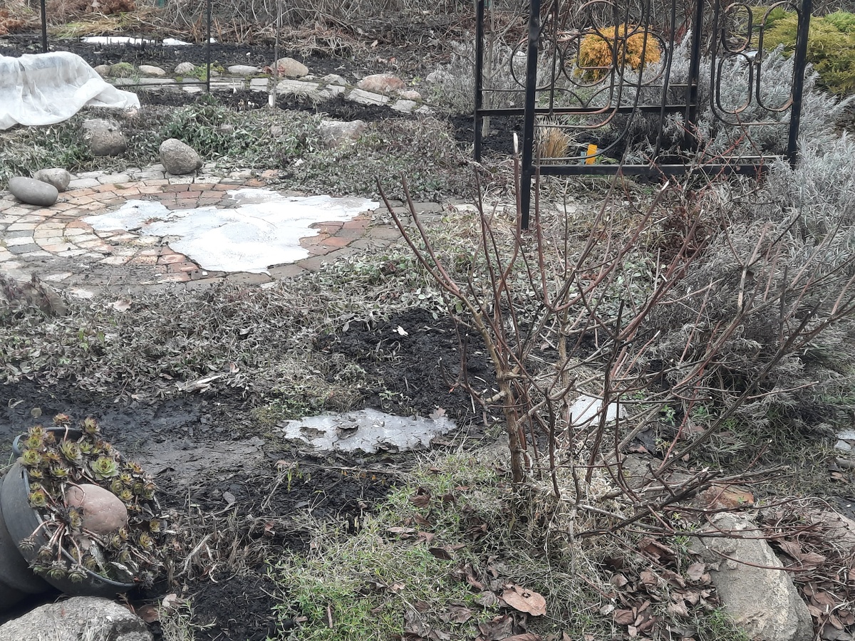 Уже подморозило чуток... Гортензия обмерзла. Убраны стол и стулья. Вычищена площадка от маршанции. Засыпаны цементом щели.