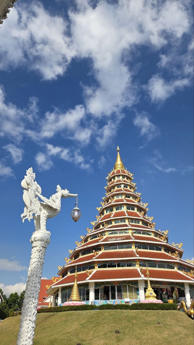 Это комплекс Ват Хуай Пла Канг. Тоже новодел 2009 года. Весь такой белый со стразиками и зеркалами. Комплекс включает в себя 9 ярусную погоду, храм и 79 метровую статую Гуаньинь, самую высокую в Тайланде. Оказалось - это НЕ Будда! Это вообще женщина - популярная Богиня милосердия из китайского Буддизма, защитница женщин, детей и моряков 🤣🤣🤣 В голову тётеньки можно подняться на лифте за 100 руб. Овца Борис метнулся пулей чтобы посмотреть через 3й глаз Богини на панораму города. Захватывающе, и с ветерком!!! Комплекс эффектный, но совсем не про духовную связь! Снова какой-то Лас Вегас(( #🐑 #Тай2026