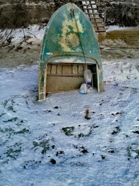 В этот раз, разговор про старую лодку... Кто-то из парней с нашего форума АРК сделал фото (которое вы видите ниже) несколько лет назад. Осенью я пару раз обращал внимание, проходя мимо на лодке — на этот торчащий из воды нос. Не думал, что так и оставят в зиму... Там, у самого берега, прирусловое течение и глубина метров 9. Берег крутой, высокий. На берегу рыбацкий стан (это в черте города на противоположном "негородском" берегу). Видимо, просто не могли поднять лодку, которая ночью напилась воды (а мотор поставил её поплавком). Судя по всему, не сильно то и нужна была лодка хозяину. Просто бросил. Привязал, чтобы не унесло — ну и пару бутылок пластиковых, чтобы видно было если сильнее притонет. Так и обледенела. Ещё каким-то чудом приподнялась (по открытой воде торчала только с-полметра). Потом (зимой) рыбаки ходили мимо — бурили, рыбачили, фотали. Лёд на Оби метра полтора в среднем... Наверное так и ушла, по весне, со льдом — вниз по реке. Мне это фото напоминает старую бездомную