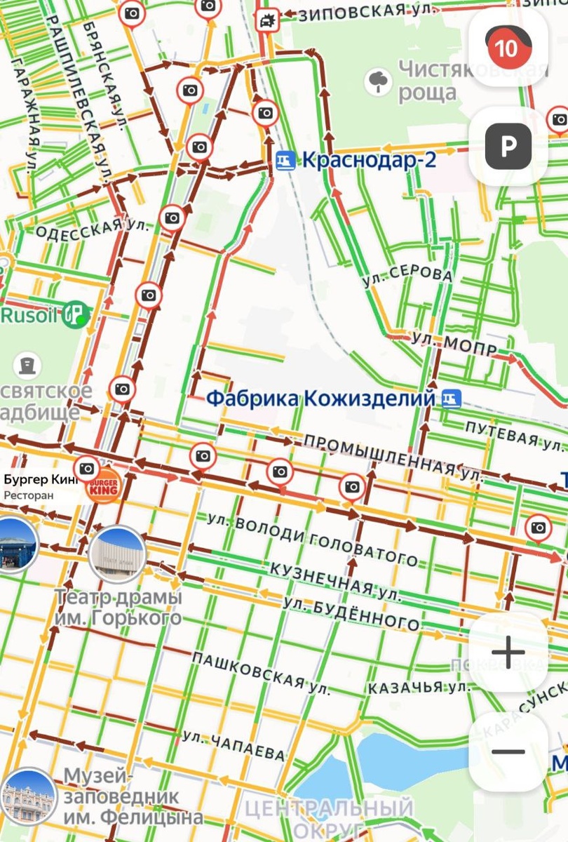 Вечер пятницы в Краснодаре — традиционные 10 баллов на дорогах.