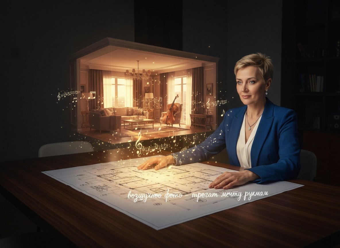 🔮. Как я научилась слышать душу дома. Продолжение истории… Пока все играли с нейросетями, создавая смешных котиков 🐈, я увидела в них нечто большее. Я увидела инструмент для создания смыслов. Это было мое хобби, моя страсть. Я погрузилась с головой 👩💻. Сегодня я на «ты» с 80-ю разными нейросетями. Могу заказать им песню 🎶, создать фотореалистичный портрет, собрать видео 🎬. Я всегда обладала высокой эмпатией и умением мыслить образами. Добавьте к этому музыкальное образование (кстати, я играла на виолончели в симфоническом оркестре 🎻, но об этом как-нибудь в другой раз 😉), и вы поймете: я привыкла чувствовать гармонию и передавать эмоции. В «нейрофотосессиях» я просто нашла новый технологичный инструмент, чтобы наполнять статичную картинку жизнью ✨. И в один момент меня осенило ⚡️. А что, если… …взять эту магию создания эмоций… …и применить ее к бетону, стеклу и кирпичу? Что, если не просто «отрендерить» диван, а показать сцену? Не просто сфоткать вид из окна, а передат