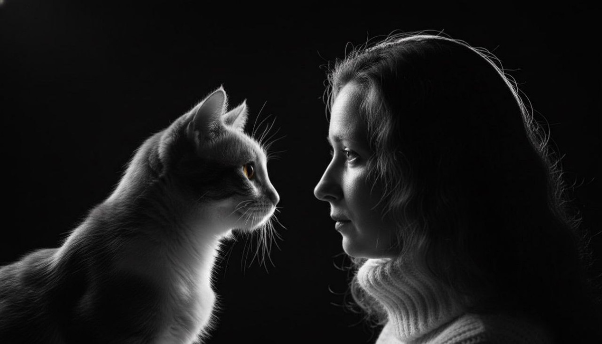). Девушка и кошка сидят друг напротив друга в профиль, смотрят глаза в глаза. Использовано сильное контурное освещение (rim light), которое ярко подсвечивает только силуэты, волосы девушки и шерсть кошки, оставляя лица в полутени. Полностью черный фон. Эмоциональная связь, доверие, кинематографично, высокая детализация, 8k. Полностью сохранить черты лица, цвет волос и глаз 💥ЖМИ