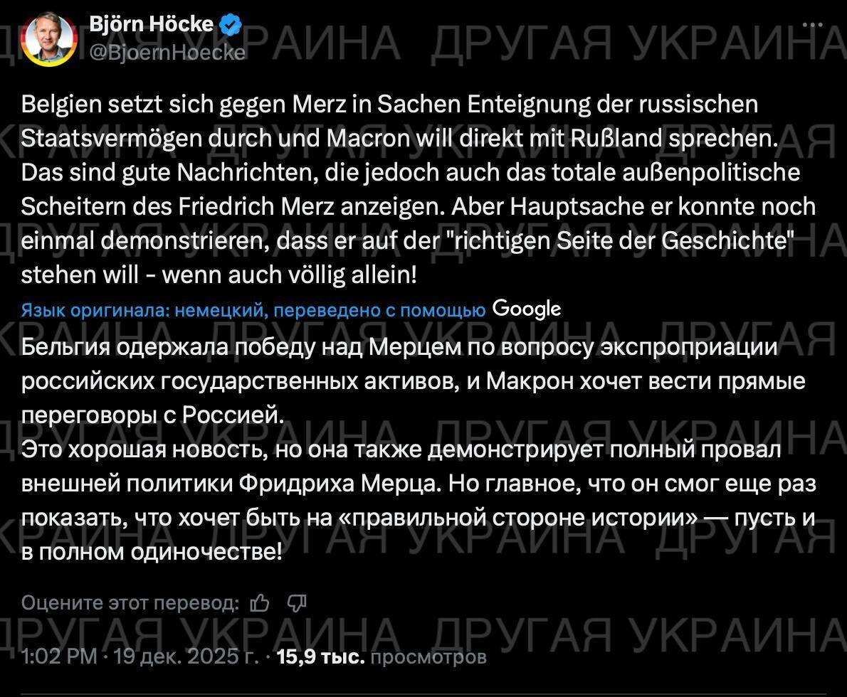 Депутат ландтага Тюрингии от партии АдГ Бьорн Хёкке жёстко прошёлся по канцлеру ФРГ. По его словам, Бельгии удалось навязать Берлину свою позицию по вопросу изъятия российских государственных активов, тогда как Макрон, в свою очередь, демонстрирует готовность к прямому диалогу с Россией. Для Европы это может быть хорошей новостью, но для Мерца — политический приговор. Хёкке подчёркивает: внешняя политика канцлера потерпела полный крах, а сам Мерц в очередной раз доказал, что стремится быть «на правильной стороне истории» — даже если остаётся в «гордом» одиночестве. Сайт "Другая Украина" / Telegram / Вконтакте / Центр поддержки Украинцев / Жалоба на ТЦК 🇷🇺"Другая Украина" теперь в МАХ