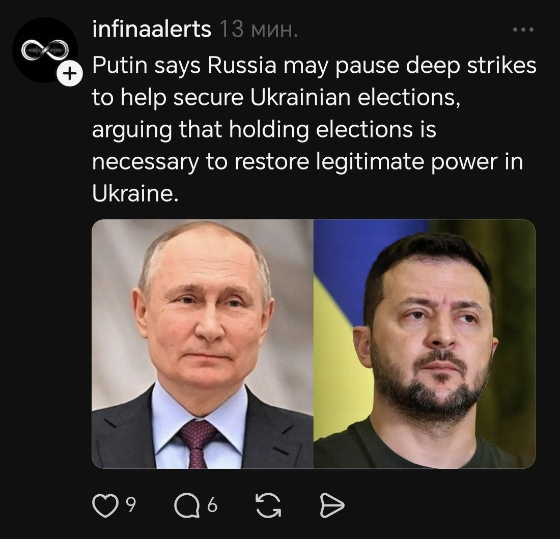 ? Когда закончится?". Ну или хотя бы почитайте тезисы на канале Два майора Западные СМИ по-началу пытались игнорировать нашего Президента. Этому способствует и весьма консервативная политика приглашения на прямую линию старых иностранных корреспондентов устаревших западных СМИ. Любой блоггер из окружения Трампа - разогнал бы тоску и заставил бы всякие Бибиси и Сиэнэн тиражировать новости из Москвы Но за несколько часов Владимир Владимирович и сам справился с этой блокадой. Шикарно взорвал западные соцсети выпад Президента про выборы на Украине, в которых должны принять участие украинцы, находящиеся в России. Зеле и его хозяевам такое явно не нравится, они предпочли бы забыть о миллионах украинцев, сбежавших от киевской хунты и нациков в Россию Страны БРИКС очень хорошо отреагировали на слова Путина о том, что мир наступить, когда Запад научится говорить с Россией с уважением. Для глобального Юга наша страна - пример того, как отстаивать национальные интересы Многие посылы, особоено