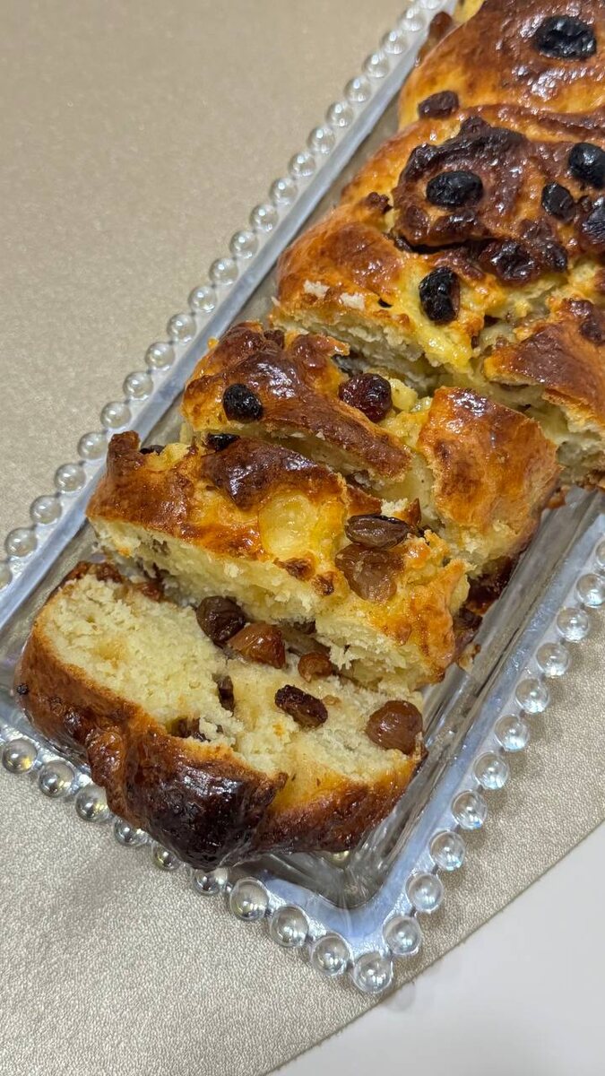 ТЕСТО: 1 пачка творога 150-200 г 40 г растительное масло 1 яйцо С0 200 г муки ВС 50 г Сахар Ванильная паста/ванильный Сахар 1/3 чл соли 1 чл разрыхритель НАЧИНКА: 50 г Сахар 150 г изюм ДЛЯ ОБМАЗКИ КОСИЧКИ: 1 желток 1 ст л молока ДЛЯ ГЛАЗИРОВКИ ПОСЛЕ ВЫПЕЧКИ: 50 г воды 30 г Сахар 20 г сок лимона ПРИГОТОВЛЕНИЕ: ✔️в чаше соединить творог (если с крупинками, то пробить блендером), сахар, ванильная паста, яйцо, растительное масло. Взбить миксером, но не долго. ✔️добавить муку и разрыхритель. Перемешать насадкой весло/лопатка. Но можно и вымешать обычной силиконовой лопаткой, потом руками . ✔️расстелить пергамент. Все тесто раскатать прямоугольником. Толщиной 3-4 мм. ✔️посыпать сверху сахаром, разложить весь изюм. Завернуть в рулет. Край защипнуть. ✔️разрезать почти до конца рулет по середине, и завернуть косичку. ✔️я переложила прям в этом пергаменте в прямоугольную форму для кекса/хлеба. В ней выпекала чтоб косичка была ровной. Но можно и без формы. ✔️желток перемешать с молоком