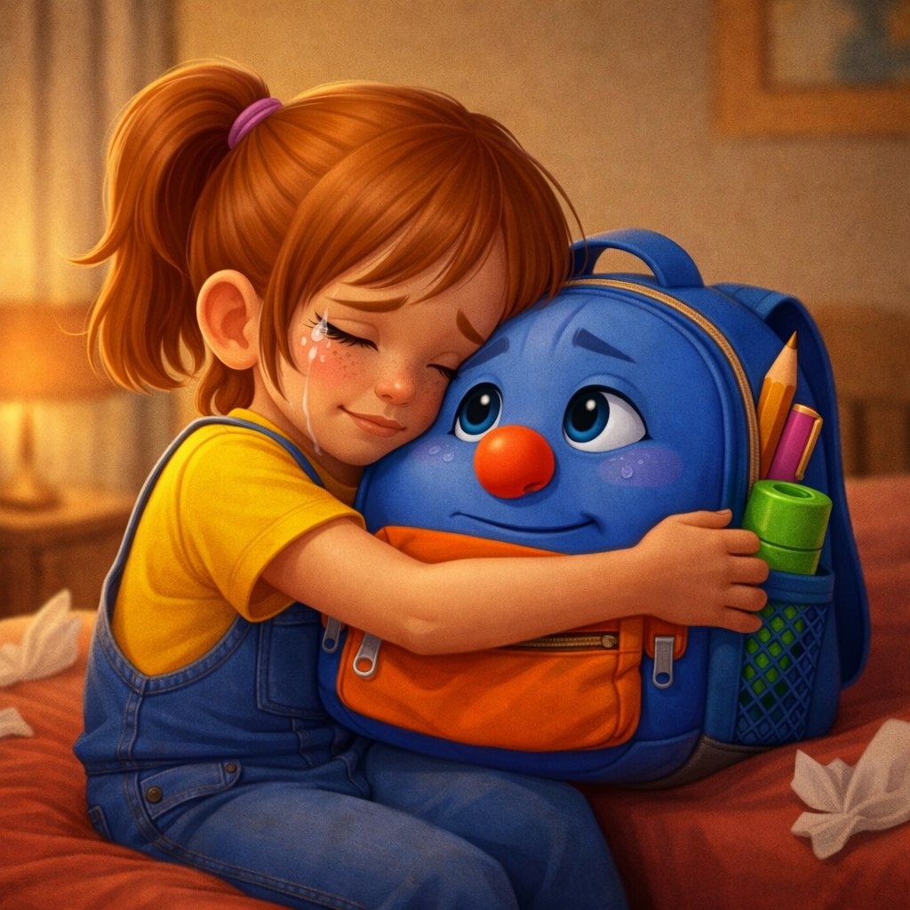 Однажды вечером Маша легла спать, обняв свой рюкзачок, и тихонько заплакала. Слеза упала прямо на молнию, и вдруг рюкзак тихонько… моргнул!