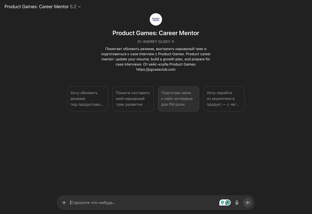 Ссылка на него: https://chatgpt.com/g/g-6945392d327c819191b3da156a66d502-product-games-career-mentor И все это бесплатно и неограниченно. Внутри вложила подход, который позволило мне сделать сильное универсальное резюме. Вижу этот GPT в качестве отличного дополнения к нашему кейс-клубу: там можно освоить продуктовые подходы с обратной связью от менторов, а затем с этой базой подготовиться к интервью. #PG_education