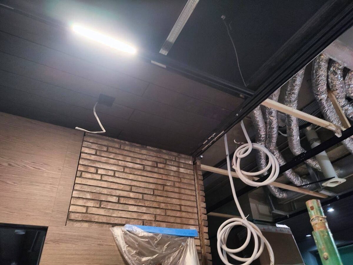 Ждали новую поставку материала аж самой Москвы, а в Казани у нас, как оказалось, совсем не развита термодревесинаНу ничего, мы её дождались и начали оформлять потолок на входной группе