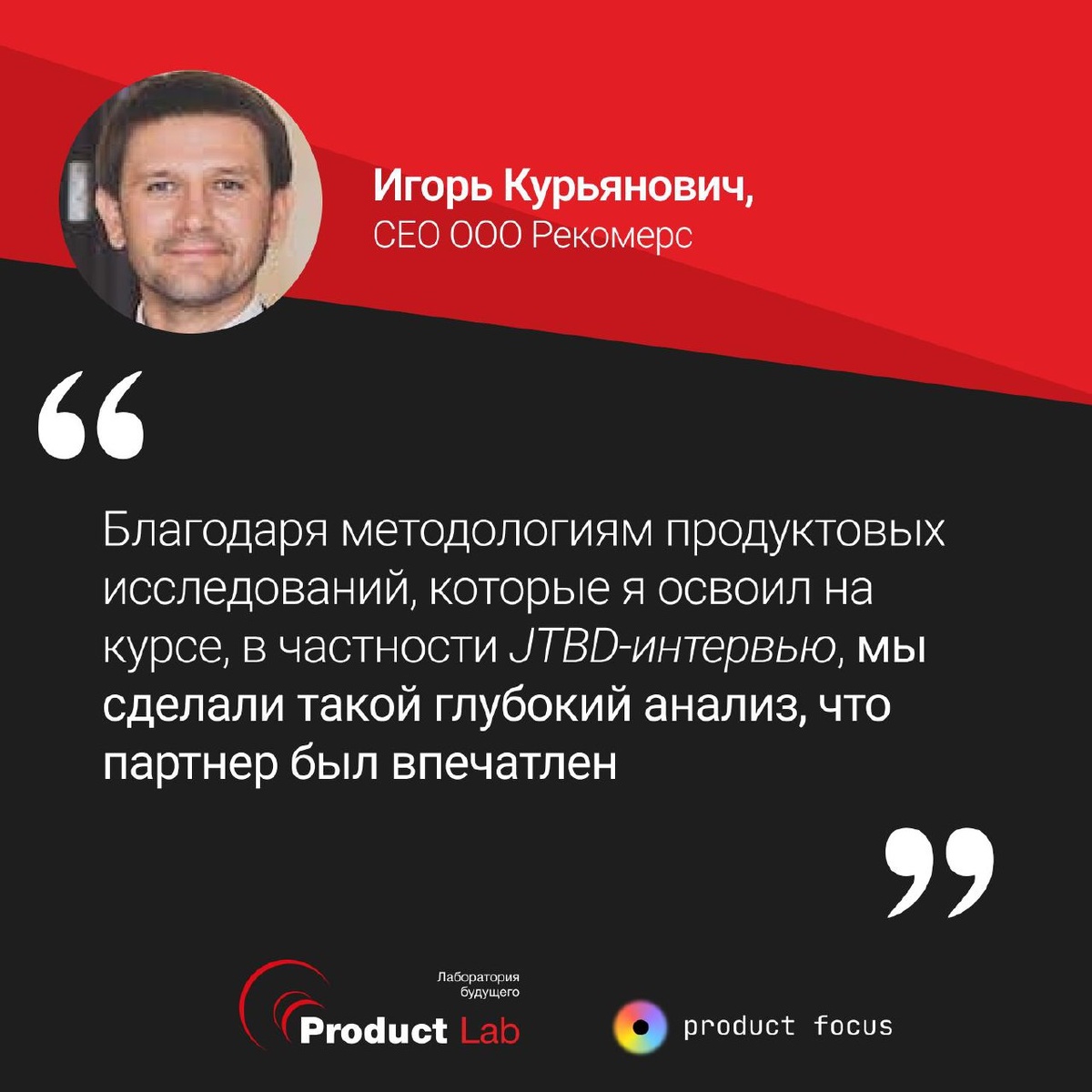 Привет, друзья! Делимся свежим отзывом на курс «Полное погружение в продакт-менеджмент». Игорь пришел на курс по рекомендации одного из наших преподавателей. Вот, что он рассказывает об опыте прохождения программы ⬇️ Благодаря программе я закрыл свои реальные пробелы по продуктовому управлению, например, в части методологии JTBD. Теперь я прекрасно знаю, как она работает. Хотя после курса в силу своей должности на практике сам я эту методологию на уровне исследователя или продакта не применяю, но могу поставить задачу и спросить с сотрудников, которые её применяют. Я закончил курс с сертификатом «с отличием». Почему? Потому что всю работу на курсе я построил на собственном рабочем живом кейсе – пилоте с крупным банком. После окончания курса я смог согласовать выгодные условия сотрудничества с банком. Благодаря методологиям продуктовых исследований, которые я освоил на курсе, в частности JTBD-интервью, мы сделали такой глубокий анализ, что партнёр был впечатлён. На основе анализа м