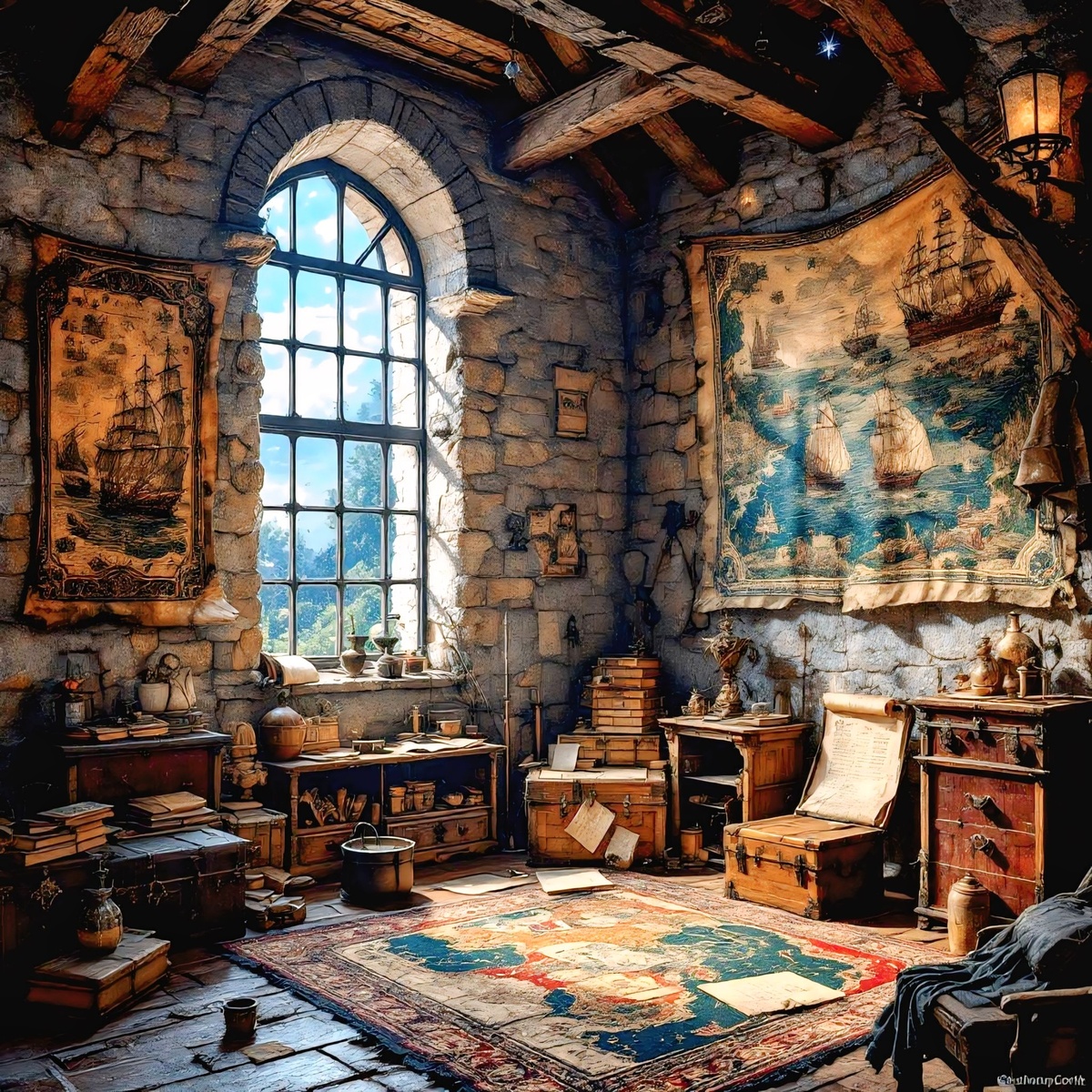 Под конец дня, с лампой в руке, он поднялся в свою новую комнату. Большая и мрачная. Окно с решёткой смотрело на ров. Кровать шикарная, с мягкой подушкой и ещё одной, с лавандой, а сверху – красное одеяло с вышитыми розами. Вдоль стен стояли закрытые шкафы, скрытые тёмными коврами. Дик обошёл комнату, приподнимая ткани, стуча по стенам, пытаясь открыть дверцы. Убедившись, что дверь крепкая, а засов надёжный, он поставил лампу и снова огляделся.