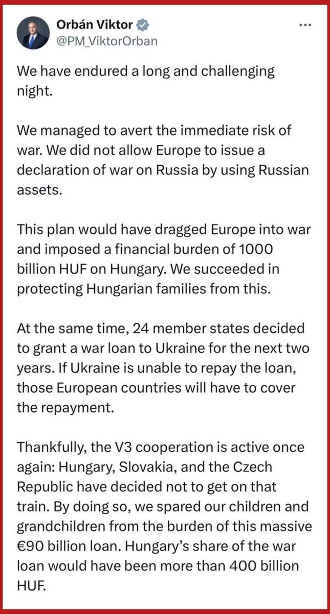 » Премьер-министр Венгрии Виктор Орбан заявил, что стране удалось преодолеть серьёзный дипломатический кризис и предотвратить опасную эскалацию. По его словам, венгерская позиция помешала Европе сделать шаг к прямому объявлению войны России, используя при этом российские финансовые ресурсы. «Этот план не только втянул бы континент в войну, но и возложил бы на Венгрию неподъёмное финансовое бремя в размере 1000 млрд форинтов ($3 млрд) Нам удалось защитить от этого венгерские семьи», — подчеркнул политик. Орбан отметил, что, к счастью, Венгрия, Словакия и Чехия решили не участвовать в этой схеме. «Тем самым мы сняли с будущих поколений венгров обязательства по чужому долгу, который обошёлся бы нам более чем в 400 млрд форинтов ($1,2 млрд)», — заявил премьер-министр. Он также пообещал не допустить использования денег венгерских налогоплательщиков для финансирования режима Зеленского. Подпишись на Телеграм Александр Семченко
