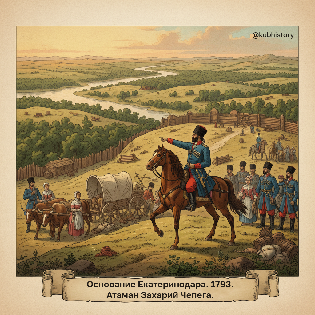 Представьте себе июль 1792 года. Екатерина II, королева российских просторов, подписала Жалованную грамоту – один из самых важных документов в истории Кубани. По этому указу огромные земли правобережья Кубани передавались Черноморскому казачьему войску в вечное владение. Казаки получили не просто земли, а полноту власти над ними: внутреннее управление, право торговли, охрану границ. Взамен они обязались охранять границу от набегов горских народов. Это был исторический момент – казачество получило свой край. 🐴 Захарий Чепега: архитектор нашего города Но земля – это еще не город. Нужна была личность, видение, воля. И она нашлась. Захарий Алексеевич Чепега – кошевой атаман (главный командир) Черноморского казачества. Его современники называли его скромным, но деятельным человеком. Он не любил парадов и показухи, но умел мечтать и воплощать мечты в реальность. Весной 1793 года Чепега с войском казаков прибыл на берега Кубани. Земля уже была их, но нужно было выбрать место для войскового