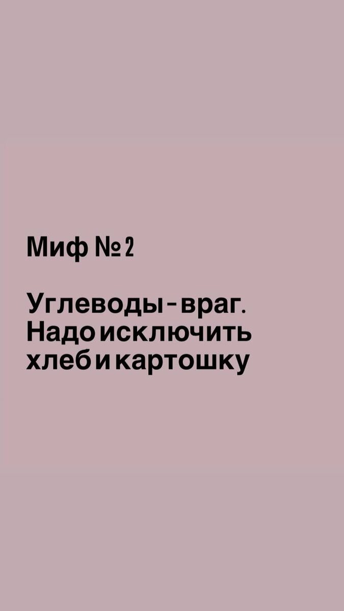 Надо исключить хлеб и картошку» Миф: Все углеводы ведут к набору веса; чтобы похудеть, нужно полностью отказаться от круп, картофеля, хлеба. Почему это не так: Углеводы — основной источник энергии. Их полное исключение приводит к усталости, снижению работоспособности и срыву. Важно не «убрать углеводы», а выбрать правильные: цельнозерновые, овощи, бобовые. Что делать вместо этого: Отдавайте предпочтение сложным углеводам: овсянка, гречка, киноа, цельнозерновой хлеб. Сочетайте углеводы с белком и клетчаткой: например, гречка + курица + салат. Ограничьте простые углеводы: сахар, белый хлеб, сладости, сладкие напитки.
