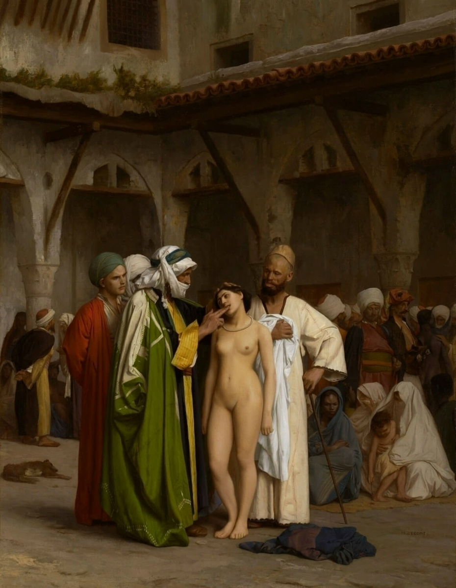 Работорговля к середине XIX века была официально запрещена в большинстве европейских стран. Однако в Османской империи она продолжала существовать вплоть до начала XX столетия. Жером, неоднократно путешествовавший по Ближнему Востоку, наблюдал подобные сцены лично. Его картины — результат скрупулёзных зарисовок, этнографического интереса и одновременно типичного для эпохи колониального взгляда.