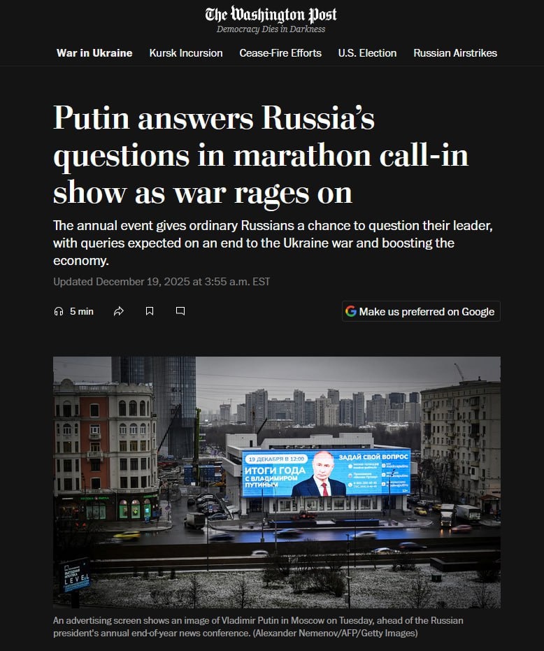 Как отреагировали западные СМИ на прямую линию Владимира Путина Западная пресса вновь внимательно следила за ежегодной прямой линией президента России Владимира Путина 19 декабря. Многие признали ее главным публичным выступлением в этом году. Параллельно отмечая «твердую позицию» главы государства. Мероприятие, представляющее собой сочетание вопросов от журналистов и граждан, транслировалось в прямом эфире. Издания отмечали активность в зале, где журналисты с плакатами своих СМИ и в национальных костюмах пытались привлечь внимание модераторов для возможности задать вопрос. В основном, фокус международных СМИ был сосредоточен на Специальной военной операции (СВО), экономических перспективах России и отношениях с Западом. Внимание многих журналистов также привлекла большая карта России, находившаяся на заднем плане в студии для записи. На ней были обозначены новые регионы страны — Донецкая и Луганская народные республики, а также Запорожская, Херсонская области и Крым. В то время как
