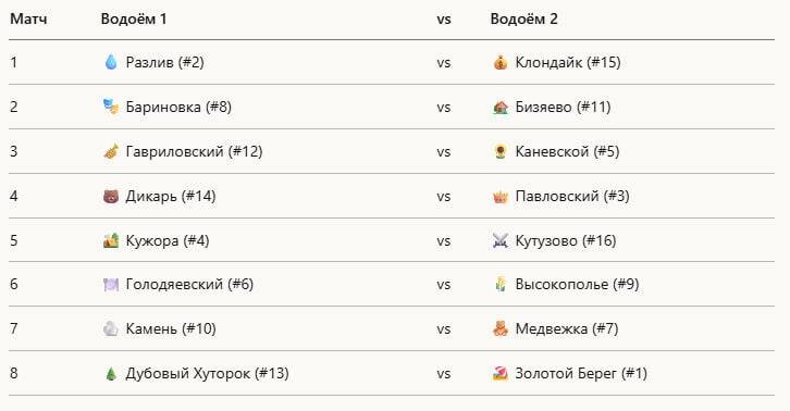 ! Для наглядности указали место, которое водоем занял на стадии квалификации. 🔥 Накиньте огоньков и пишите, какая пара в 1/8 самая интригующая для вас. Давайте вместе пошумим 📣 Мы еще точно подтянем сам формат жеребьевки. Пока это первый опыт. И в трансляции выше можете посмотреть все расклады и прогнозы от Carptoday! #carptoday