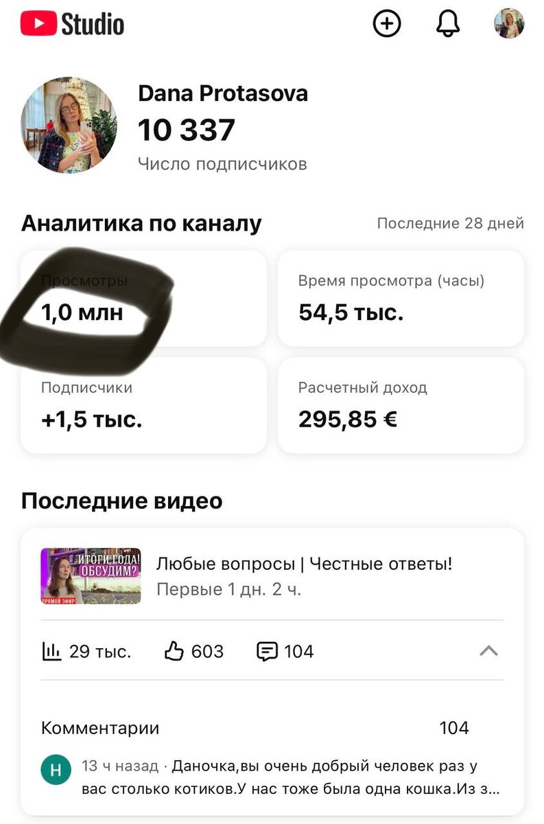 ! Во-первых, я первый раз в жизни вижу, чтобы в ютюбе у меня за месяц был миллион просмотров. Фшоке! Во-вторых, есть вероятность заработать за декабрь миллион. Нет, я не потрачу ни копейки на подарок маме - бббгггг я прям чувствую, как это вас триггерит, но праздники вообще мимо, это обычный день календаря. Ничем не отличается. Но благодаря таким доходам я смогла оплатить все налоги (обычно они у меня болтаются до мая, спасибо нашей лояльной системе), отправить продюсеру 1000 евро вместо 600 (правда, сказала, чтобы всё не тратил, мало ли 😁) и очень хорошо себя чувствую. Теперь можно спать!