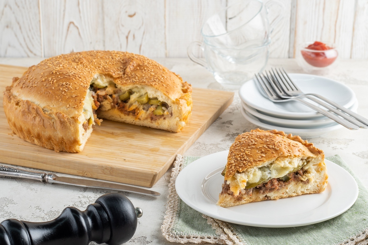 Тот самый знакомый вкус чизбургера, только в домашнем формате: с мягким тестом, сочной начинкой и хрустящей корочкой сверху. Такой пирог удобно резать, удобно подавать и удобно есть — особенно когда за столом вся семья или гости.