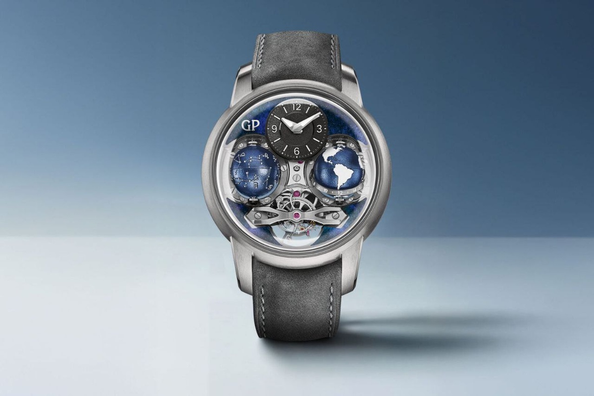 Girard-Perregaux представляет уникальный экземпляр Bridges Cosmos 2025 года - переосмысление модели 2019-го с новыми материалами и отделкой. Это астрономические часы, соединяющие небесный и земной миры: фирменный турбийон в центре, два вращающихся глобуса для сидерического и гражданского времени, мини-планетарий на запястье. Корпус и дизайн Титановый корпус диаметром 47 мм и толщиной 22,2 мм с сатиново-полированной отделкой. Без заводной головки: четыре вращающиеся ушки на задней стороне для завода, установки времени и синхронизации глобусов, с люминесцентными пиктограммами. Куполообразное сапфировое стекло с антибликом, задняя крышка с гравировкой уникальности. Водозащита 30 метров. Антрацитовый ремешок из телячьей кожи с нубуковой отделкой и титановой застёжкой. Циферблат и функции Двухслойный: таитянский перламутр под полупрозрачным синим авантюрином. Центральный чёрный циферблат с пескоструйной обработкой и солнечными лучами, золотые метки, стрелки dauphine с синим Super-LumiNova