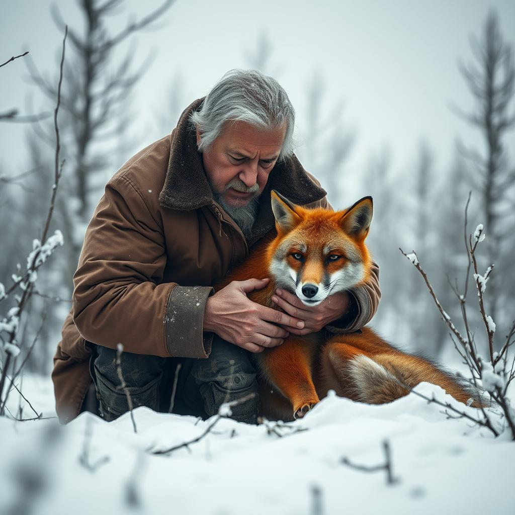 Лисица увидела человека и зашипела, прижав уши. В её янтарных глазах читался дикий страх. Она дергалась, пытаясь освободиться, но коряга была слишком тяжелой.