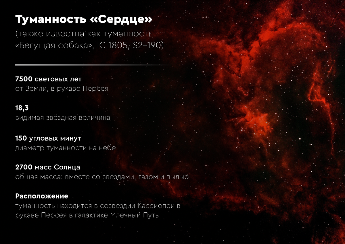 Знаете, иногда Вселенная подкидывает такие сюрпризы, что диву даёшься. Сидишь ночью у окуляра, замёрзший уже, кофе остыл, а она — такая вся из себя — раскинулась в созвездии Кассиопеи, этакая космическая валентинка. Только размером, ясное дело, со сто с лишним световых лет. Туманность «Сердце». IC 1805, если по-паспорту. А ещё — «Бегущая собака», что мне всегда казалось куда честнее. Присмотритесь к снимкам: не столько символ любви, сколько силуэт пса, несущегося во весь опор по просторам Млечного Пути. По-моему, это даже лучше. А начинается всё, как водится, со смерти. Нет, не ждите мрачной истории. В космосе смерть — это чаще всего прелюдия к чему-то новому. В самом центре этого светящегося газового облака — скопление молодых, дерзких звёзд с именем Melotte 15. Им всего-то пару миллионов лет, младенцы по галактическим меркам. Но родились они из праха, из остатков чего-то грандиозного. Представьте: старая массивная звезда когда-то — может, миллион, может, два назад — закончила свой п