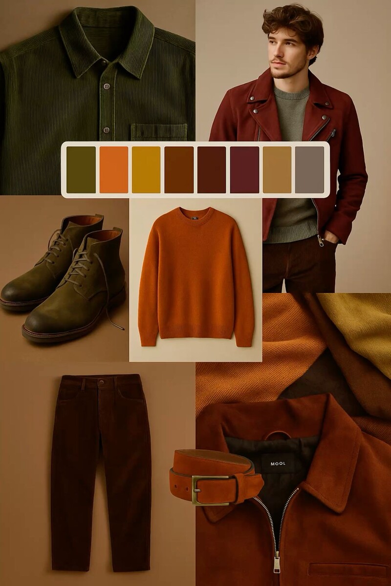 Темная (глубокая) осень для мужчин — это цветовой сезон с насыщенными, теплыми и глубокими оттенками, вызывающими ассоциации с густым лесом поздней осени или крепким виски у камина. Палитра отражает мужественную силу природы: высокий контраст между тёмными волосами, бронзовой кожей и выразительными глазами создаёт образ уверенного, харизматичного лидера. Кожа имеет теплый подтон — от оливкового до насыщенного загара, волосы густые тёмно-каштановые или чёрные с теплым отливом, глаза — глубокие карие, тёмно-зелёные или янтарные. Палитра Темной осени для мужчин строится на теплых, землистых тонах с золотистым подтоном: горький шоколад, тёмный терракотовый, глубокий индиго, оливковый хаки и кремовый бежевый. Эти цвета подчёркивают естественную глубину и силу, создавая строгий, но уютный силуэт. Чистый белый или чёрный избегают — они слишком резкие; вместо них — тёмно-коричневый костюм или тёплый серый свитер для аутентичного, мужественного стиля. Цвета усиливают их естественную уверенность