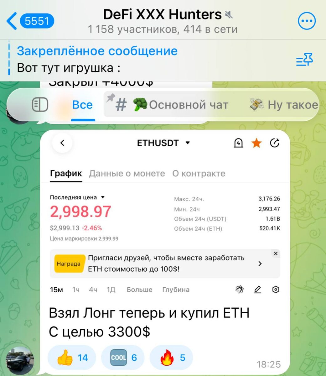На скрине - чат DeFi XXX Hunters. Не сигналы «на удачу», а живые сделки, входы и логика действий. 💬 В чате: - разбираем рынок в моменте - заходим в лонги и шорты без лишнего шума - делимся точками входа и целями - без инфо-цыганства и пустых обещаний 🔥 ETH взят в лонг - цель $3300 И таких сетапов в чате хватает. 🎄 До Нового года — БЕШЕНЫЕ СКИДКИ Отличный подарок: - себе, чтобы зарабатывать в 2026 - другу или близкому, кто давно хотел разобраться в крипте 💡 Один удачный вход может отбить доступ многократно. 👉 Вступай в чат Хантеров прямо сейчас Пока действуют новогодние условия — потом будет дороже. ВСТУПИТЬ В ЧАТ СО СКИДКОЙ