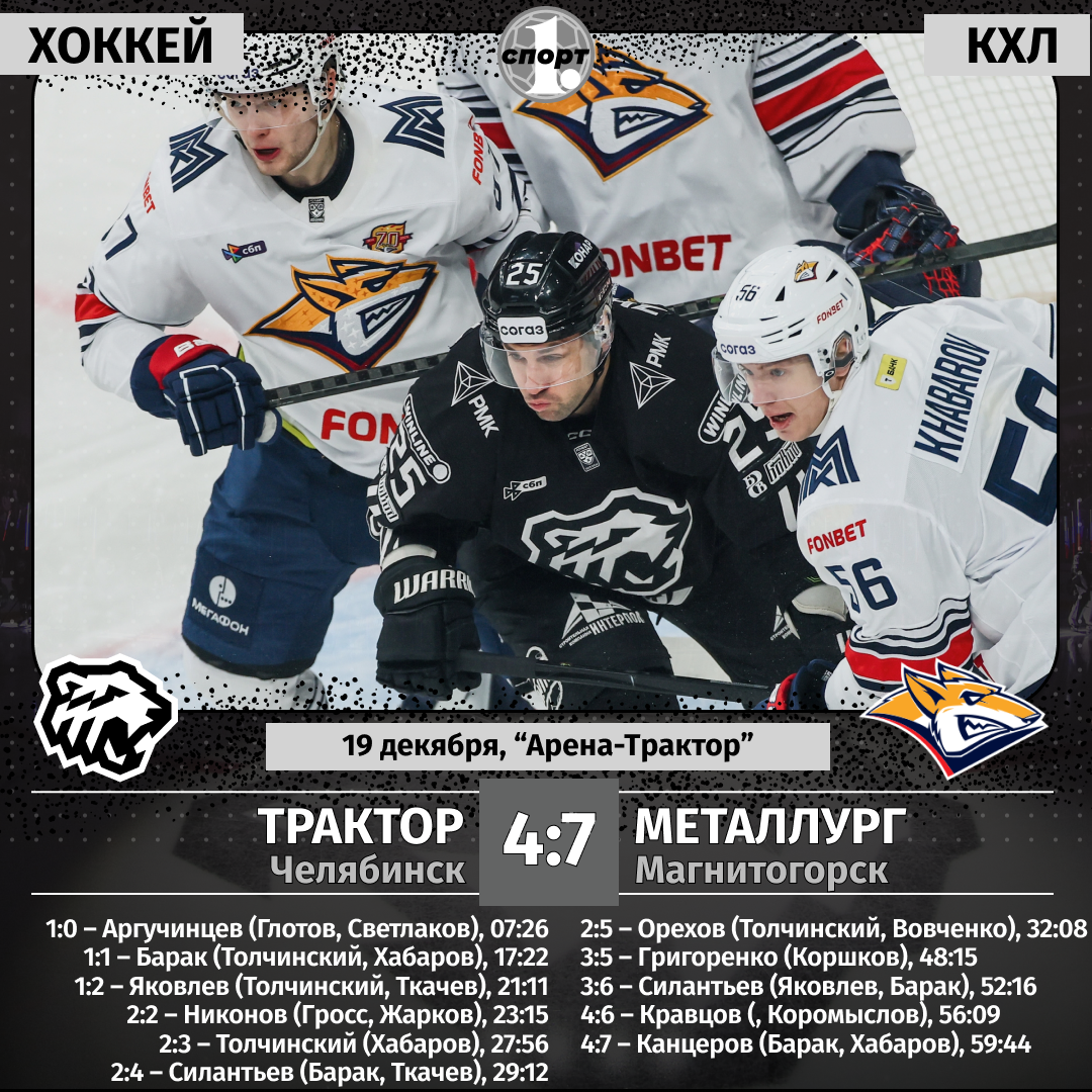 Хоккеисты челябинского «Трактора» второй раз в сезоне уступили магнитогорскому «Металлургу» на своем льду в чемпионате КХЛ — 4:7. Сегодня, 19 декабря, «черно-белые» при хорошей игре вновь уступили землякам-соседям. В очередной раз их сгубили действия в обороне и удаления в простых ситуациях. У «сталеваров» лучший матч в сезоне провел форвард Сергей Толчинский, набравший 4 (1 + 3) очка, сообщает корреспондент ИА «Первое областное». Это был уже второй матч в текущем сезоне между южноуральскими хоккейными командами. Первая игра, прошедшая 11 ноября в Челябинске, завершилась победой магнитогорцев со счетом 4:3. Но случилось это еще тогда, когда «черно-белая» дружина находилась в разобранном состоянии, а руководил ею Рафаэль Рише с приставкой «и. о.». Сегодня был первый экзамен в боевой ситуации для Евгения Корешкова. Накануне ему доверили пост главного тренера команды. Любопытно было посмотреть на то, как он руководит коллективом и насколько готовы сами хоккеисты биться за нового хедкоуча