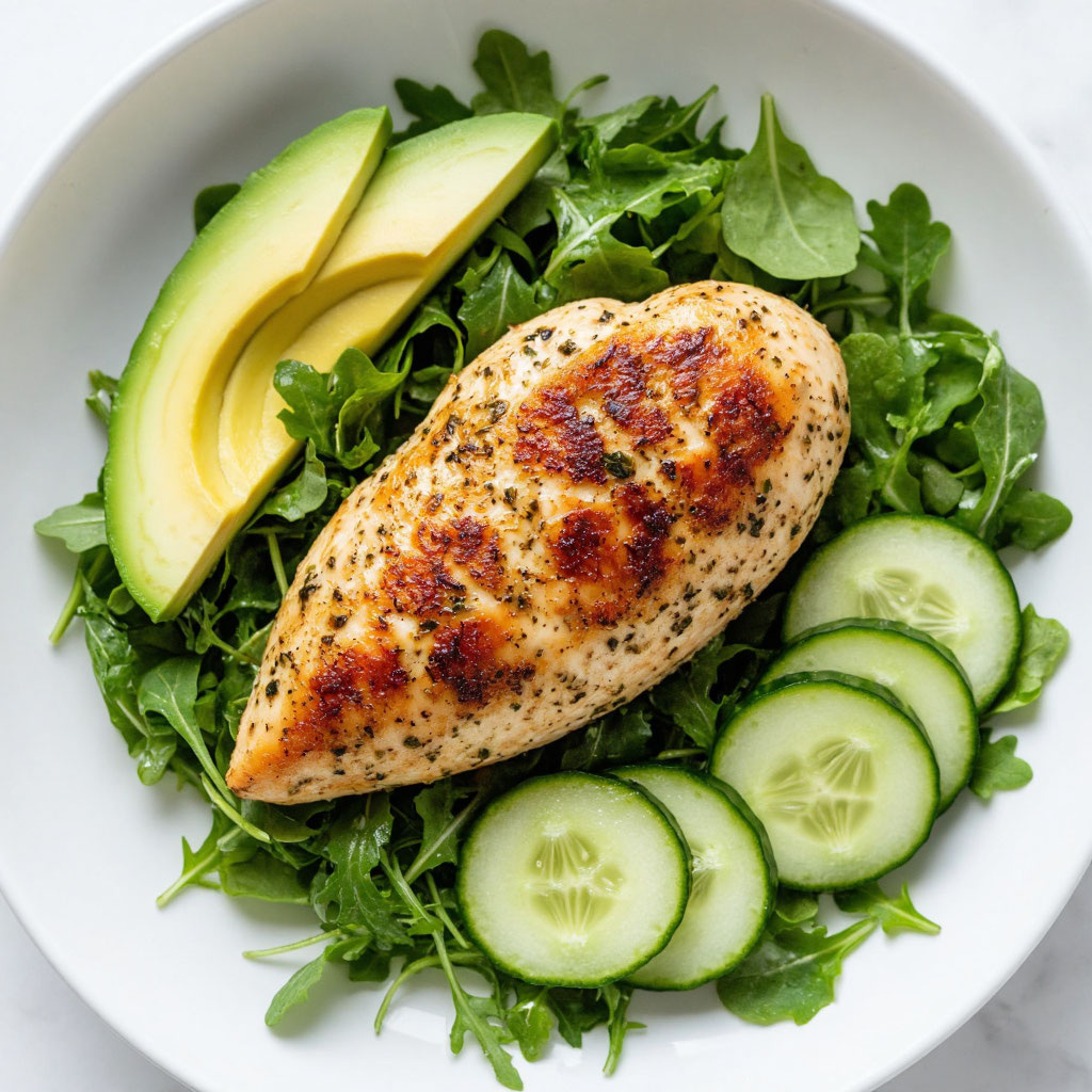 Курицу отбейте, посолите и обжарьте на гриле или сковороде-гриль без добавления масла. Авокадо очистите и разомните вилкой, добавьте немного натурального йогурта, посолите и перемешайте. Огурец порежьте тонкими ломтиками. На тарелку выложите слоями кусочки курицы, пюре из авокадо и огурцы, украсив сверху зеленью.