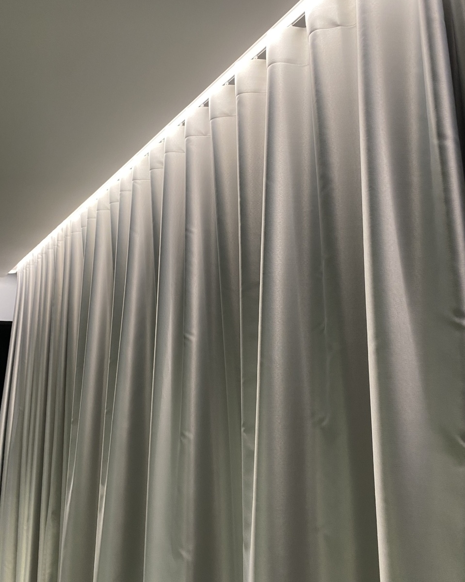 Если у вас предусмотрена достаточно широкая ниша под карниз, то лучшим способом создать красивую равномерную драпировку будет система «волна»: профильный карниз с кордовыми глайдерами и специальная