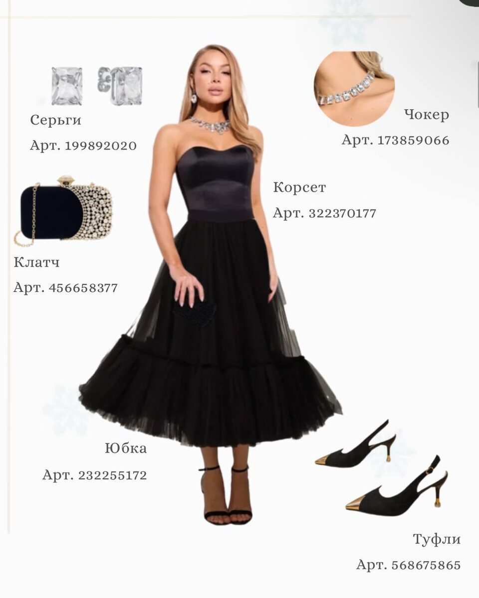 Этот образ — про эффектное появление. Воздушная юбка с тюлем создаёт ощущение праздника, а корсет подчёркивает талию и формирует красивый силуэт «песочные часы». Чёрный цвет добавляет благородства и делает образ универсальным: он смотрится одинаково выигрышно и при вечернем свете, и на фотографиях.
