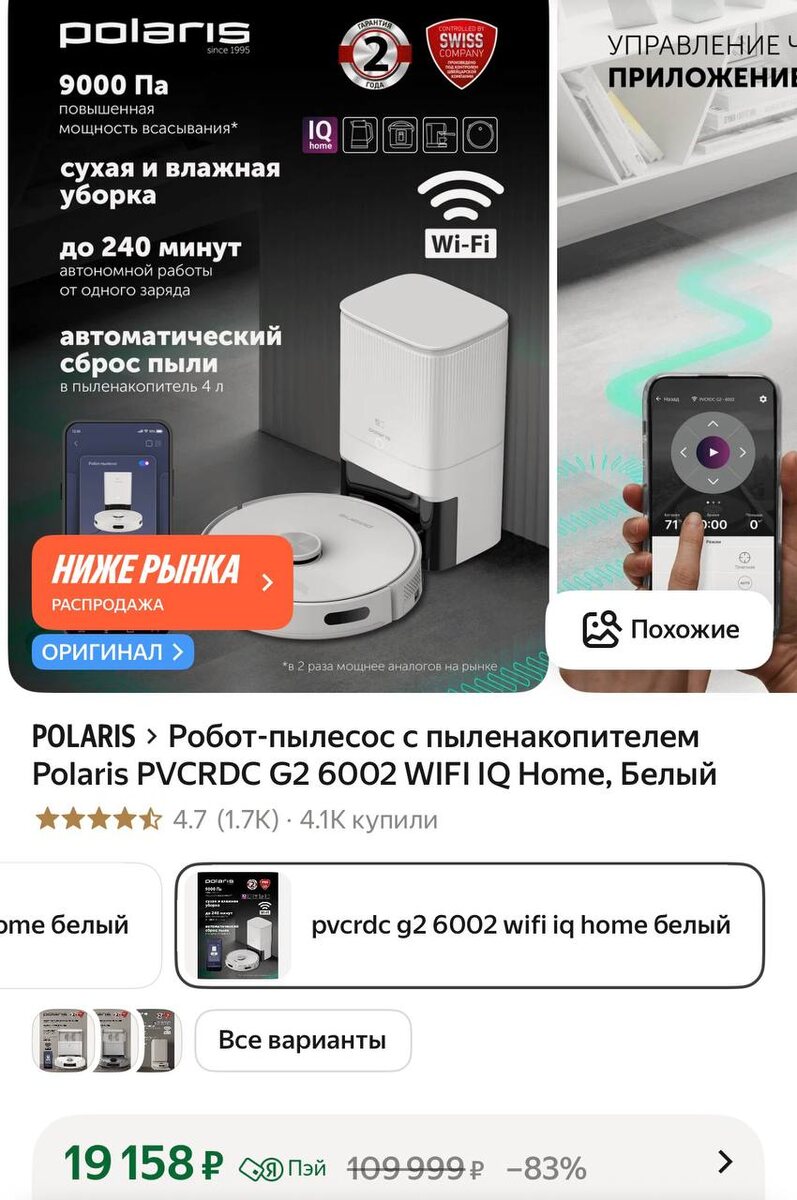 Робот-пылесос с пыленакопителем Polaris PVCRDC G2 6002 WIFI IQ Home, Белый