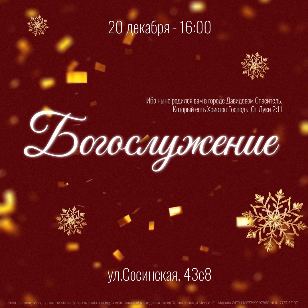 ! 20 декабря / 16:00 / Сосинская, 43с8 «Возрадовался я, когда сказали мне: "пойдём в дом Господень".» - Пс. 121:1 Когда мы собираемся вместе в доме Божьем, Он укрепляет, наполняет и обновляет наши сердца. Пусть это служение станет временем единства, поклонения и живой встречи с Богом! Ждём каждого 🙏