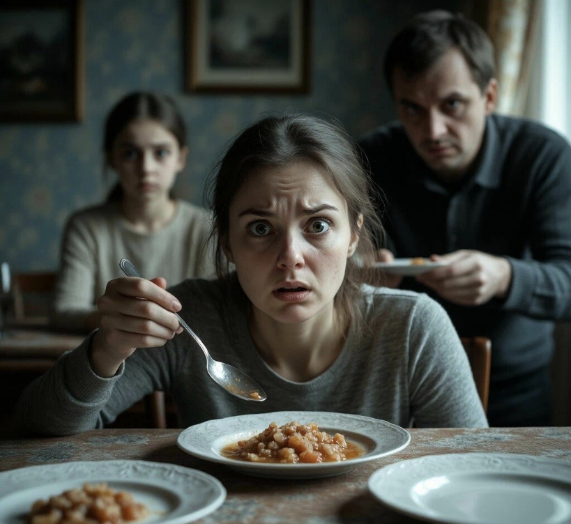 Оля поднесла свою ложку ко рту, но в этот момент почувствовала, как Алина сильно и испуганно дёрнула её за рукав свитера под столом. Мать наклонилась к дочери, делая вид, что поправляет ей салфетку.