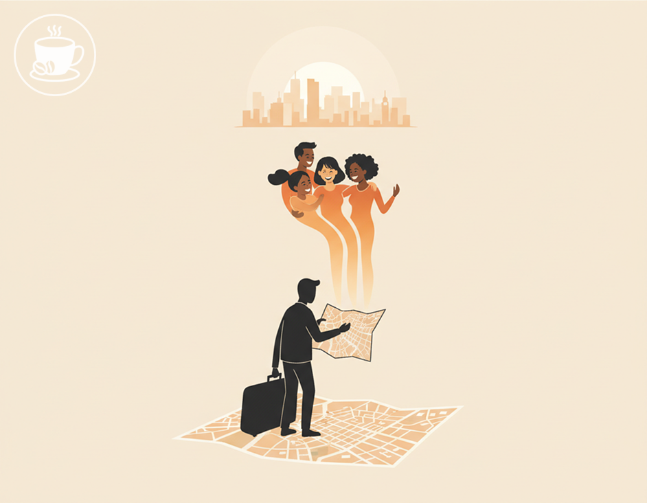 В самолёт я заходил с ощущением, что в ручной клади у меня не чемодан, а вся прошлая жизнь. А здесь были: квартира, ноутбук и… ноль знакомых. 🏙️ День 1–3. Эйфория и пустота Днём я гулял и делал вид, что всё нормально. А вечером ловил тишину: “а кому я могу написать?” 🏙️ День 4. Пытаюсь “в офлайне” Коворкинг, попытка “быть общительным”. И реальность: наушники, Wi‑Fi, чайник — и никаких людей. ☕ День 5–6. Первый онлайн‑кофе Я попробовал короткий формат 1:1. Не “дружба навсегда”, а просто спокойный контакт. И неожиданно стало легче: я увидел, что я не один в этом. 👥 День 7. Маленькая группа Созвон группой + понятные правила (можно молчать, можно без камеры). И впервые появилась мысль: “я могу встроиться”. 🏙️ День 8–10. Первая офлайн‑встреча Не тусовка на 40 человек. А прогулка/кофе маленькой группой. И там внезапно стало просто. ✨ Что я понял 1) Одиночество — не стыдно. 2) Общение — это маршрут. 3) Малые форматы реально работают. напиши город + 1 интерес. Я подкину идею “первого шага