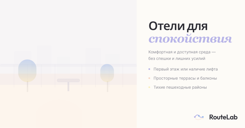 Один отель — одно направление. Лифты/минимум ступенек, рядом парки и аптека.