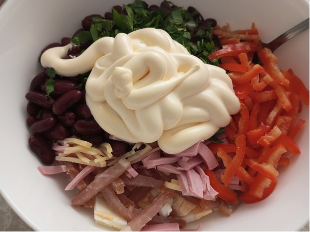 Ингредиенты: - фасоль консервированная – 1 банка; - ветчина – 200 гр.; - яйца – 2-3 отварных; - перец сладкий болгарский – 1 среднего размера; - сыр твердых сортов – примерно 60 гр.; - майонез – по вкусу; - зелень петрушки – по вкусу. На этом фото добавила два кусочка копченого мяса. Отварные яйца добавляю не всегда. Отварные яйца, сладкий перец, сыр, ветчину нарезать соломкой, добавить консервированную фасоль, заправить майонезом с мелко нарезанной петрушкой, перемешать. Приятного аппетита.