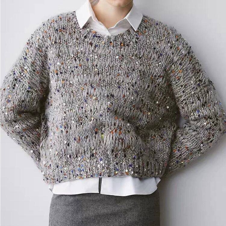 Взять 1 конец хлопка с пайетками 3+6 мм Добавить по вкусу 1 или 2 конца вспушенного мериноса/мохера/кашемира/альпаки - добавку можно сделать монохромной серой, либо любого оттенка (интересное сочетание серый+голубой/серый+графит/белый+серый) Подберите простой узор и крупные спицы. ( чтобы вес вещи был меньше) Свяжите красоту. В наличии белый хлопок с красно-синей пайеткой Цена 600₽/100 г